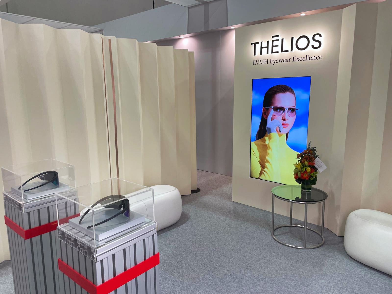 L’espace Hospitality Suite Thélios, mis en œuvre par Them’s Concept, est un univers lumineux et épuré, reflétant l’excellence et le savoir-faire de la marque. Cet espace éphémère haut de gamme met parfaitement en valeur les produits Thélios. Une séparation permet de cloisonner les espaces en vue des rendez-vous professionnels. L’espace est bien dégagé et permet une circulation aisée des visiteurs.