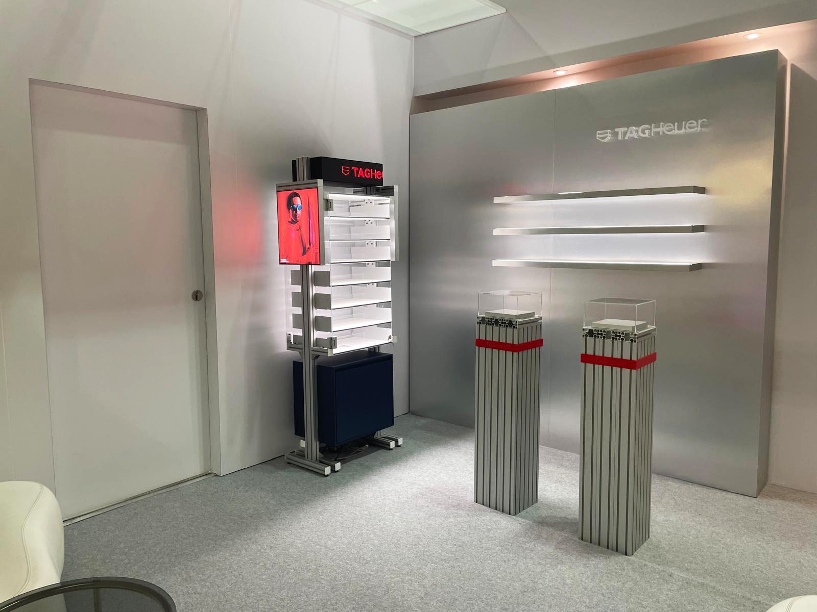 De nombreux lieux d’exposition produits sont présents, avec des stèles et des étagères. L’éclairage est soigné afin de mettre en avant les différentes collections. Un logo rétro-éclairé et des visuels également rétro-éclairés permettent d’exposer de nombreux éléments de communication.