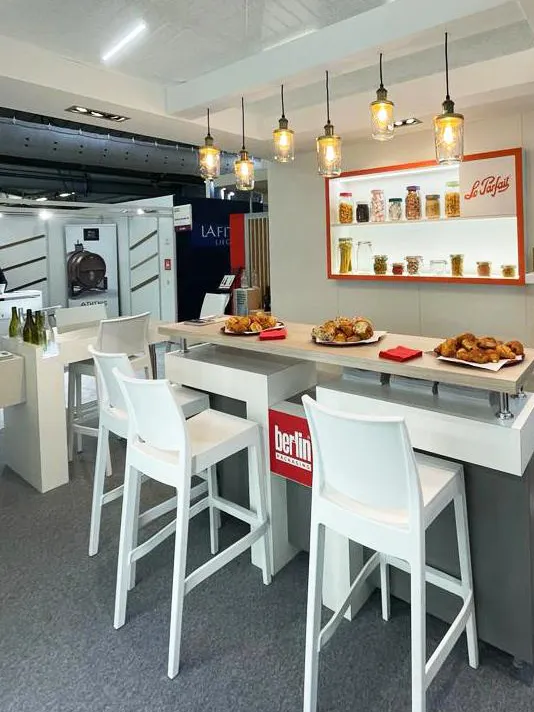 Them’s Concept est ravi d’accompagner la société Berlin Packaging pour cette nouvelle édition du salon SITEVI Montpellier pour la conception et réalisation de ce stand sur mesure. Le stand offre divers espaces d’exposition produits : stèles et niches retro-éclairées, meuble traversant, diverses étagères, etc. permettent la présentation de nombreuses bouteilles & bocaux. De nombreux espaces de discussion sont disponibles permettant plusieurs rendez-vous en simultané. Les espaces de discussion sont variés, certains sont cloisonnés pour des échanges plus confidentiels. Un comptoir-bar offre un espace d’attente pour les partenaires et crée un lieu convivial. Une touche originale est apportée à l’espace par l’utilisation des bocaux Le Parfait pour les suspensions au-dessus de l’espace bar.